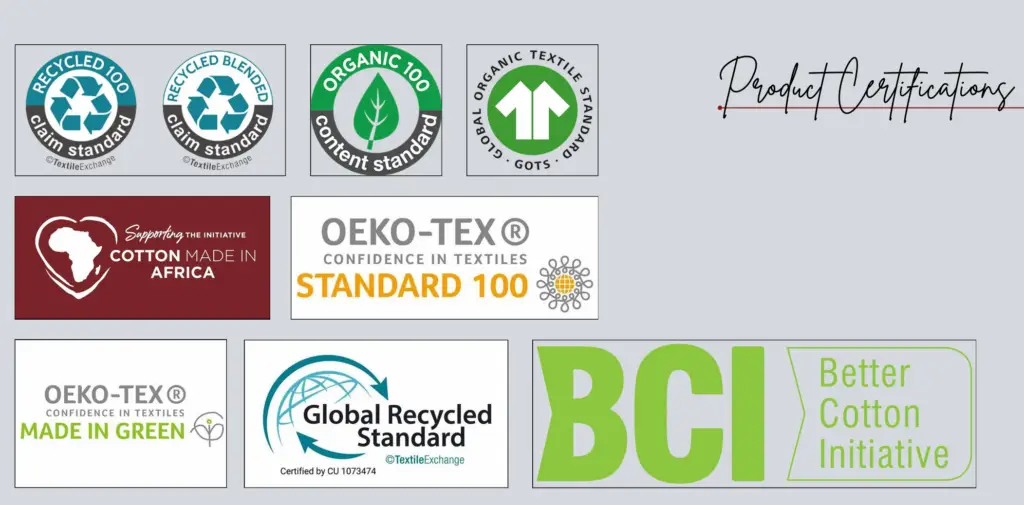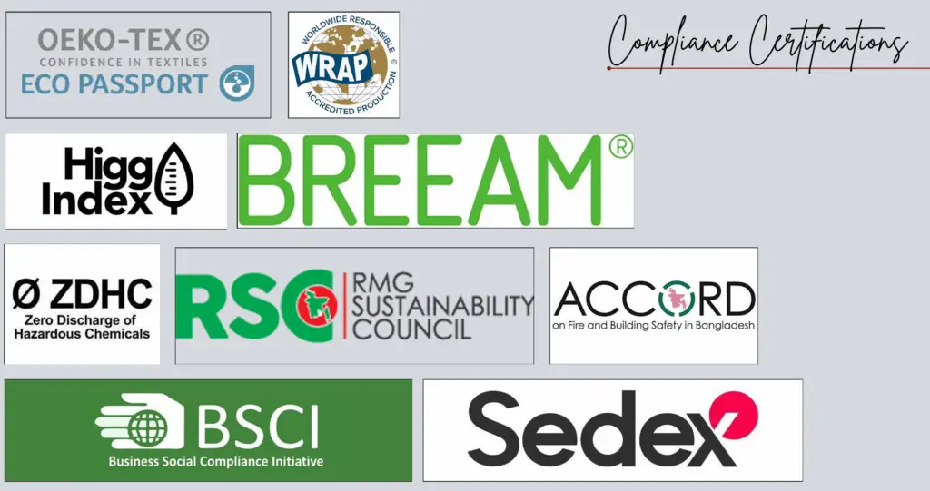 • Social Compliance: Fair wages, safe working conditions, and adherence to labor standards such as BSCI, SEDEX, OEKOTEX, STEP BY OEKOTEX, GOTS, OCS.